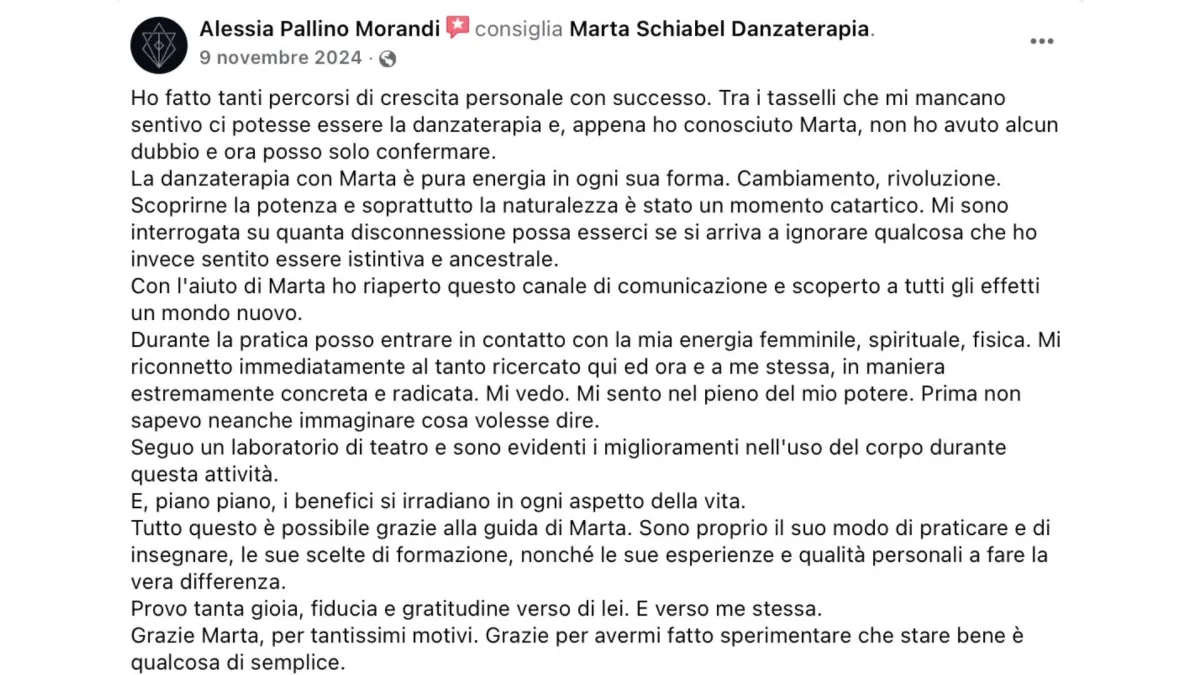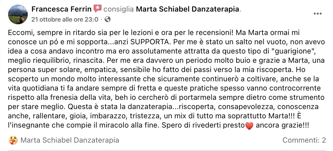 Ho imparato a praticare il movimento consapevole, la danzaterapia e a dare uno spazio di espressione alle emozioni. È stato, ed è ogni giorno, un viaggio di trasformazione che mi ha permesso di ritrovare la calma e di continuare a coltivarla.