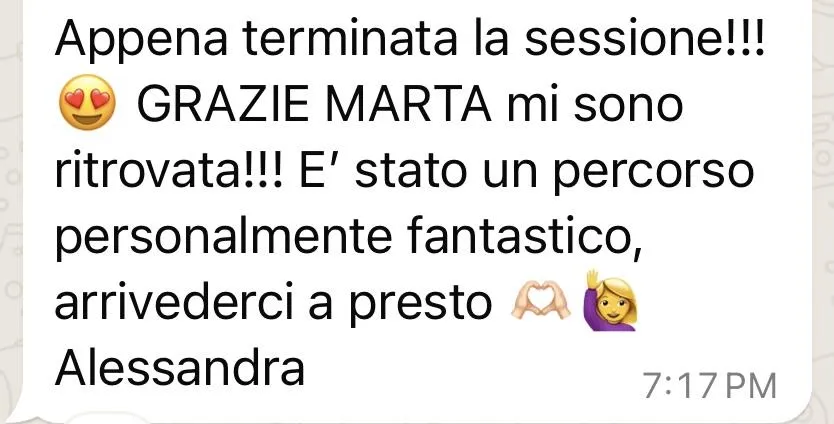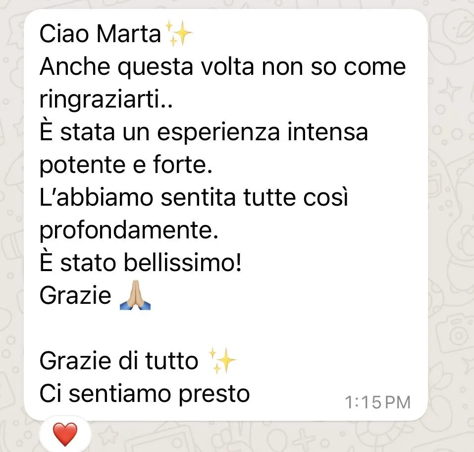 Durante il percorso, ti accompagnerò con grande sensibilità, rispettando i tuoi ritmi e senza forzare nessun processo.