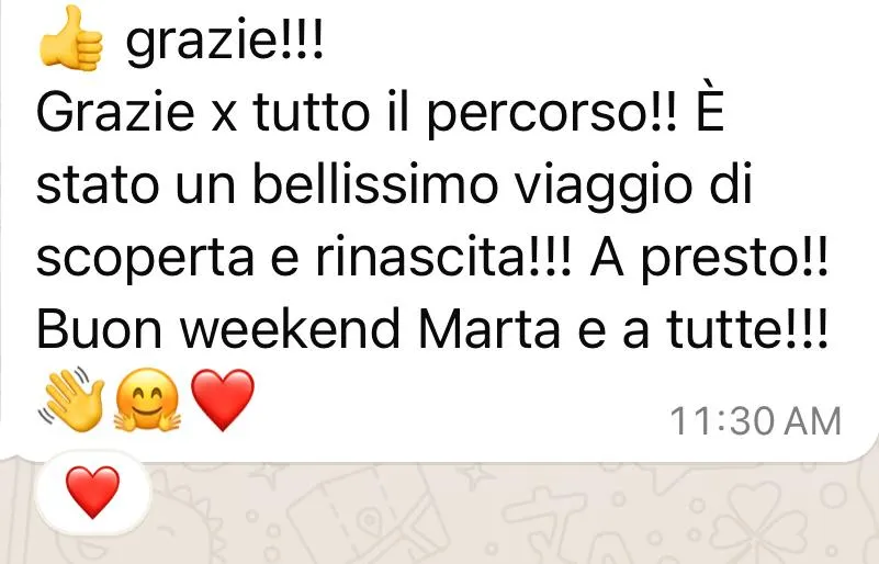 Per iniziare il percorso vengono selezionate solo 5 persone al mese, di conseguenza sono molto attenta a dare la possibilità di iniziare a chi ha i prerequisiti e vuole davvero fare un percorso di rinascita e riscoperta di se.